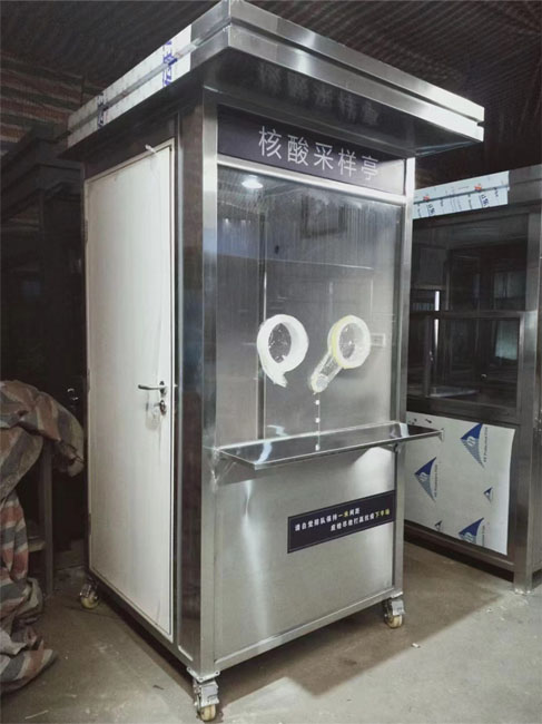 核算采樣亭是一款專為咽擾子和鼻拭子取樣工作設計的產品,設備通過配置的通風凈化系統將潔凈安全的空氣送入內部空間,并使內部保持相對正壓狀態,通過構建隔離的正壓空間,從而使艙體內部空氣與外艙隔離,避免外艙空氣進入艙體內部,進而有效保護內部醫護人員的安全,避免其因采樣工作而受到感染,保證安全的同時,提升保護人員操作靈活性和舒適度,節省了檢測時間,提高了檢測效率。